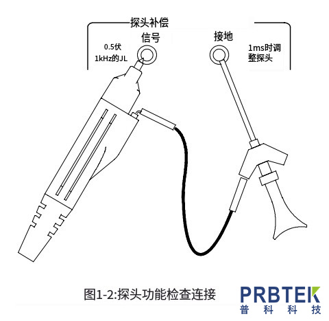 将探头安装到示波器上后,可使用示波器前面板上的探头补偿连接进行功能检查。见图1-2所示。