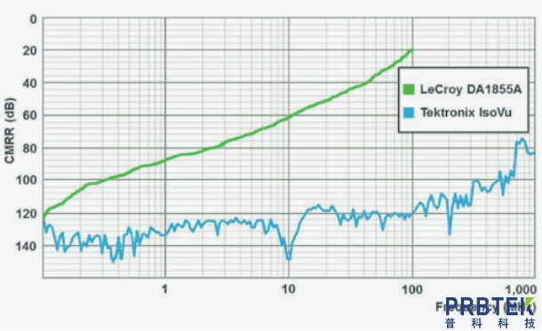 实际上,至少 80 dB (10,000:1) 的 CMRR 将产生可用的测量结果。大多数差分探头可以在直流和低频下轻松获得 80 dB 或更高的 CMRR,因为可以精确调整组件。随着测量频率的增加,差分探头的 CMRR 会降低,因为失配变得越来越难以控制。在 100 MHz 时,大多数测量系统的 CMRR 能力为 20 dB 或更低。