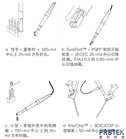 为特定应用领域(如探测表面封装设备)设计的探头可能在标准附件包装中包括额外的探头尖端适配 器。另外,可以作为探头选件,提供各种专用附件。图2说明了为用于小型探头而设计的多种探头尖端适配器类型。